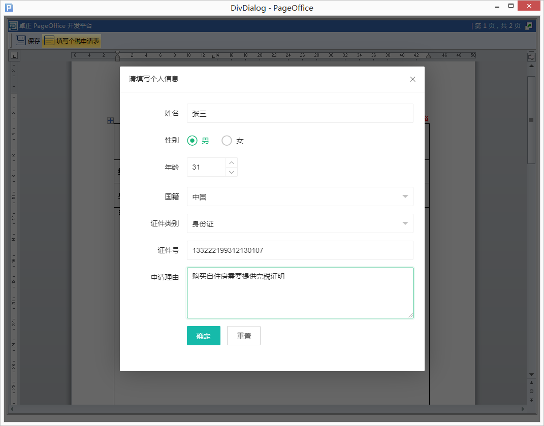 点击自定义工具栏中的“填写个税申请表”按钮,弹出前端框架内置模态框窗口,填写个人信息,如下图所示: