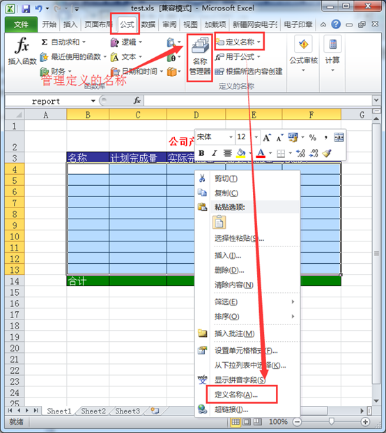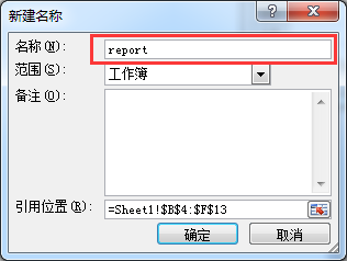 - 在选中的单元格区域上,“右击→定义名称”(或者点击Office工具栏上的“公式→定义名称“),在名称输入框中输入该区域的名称,如命名为“report”,点击“确定”按钮即可。如下图所示。