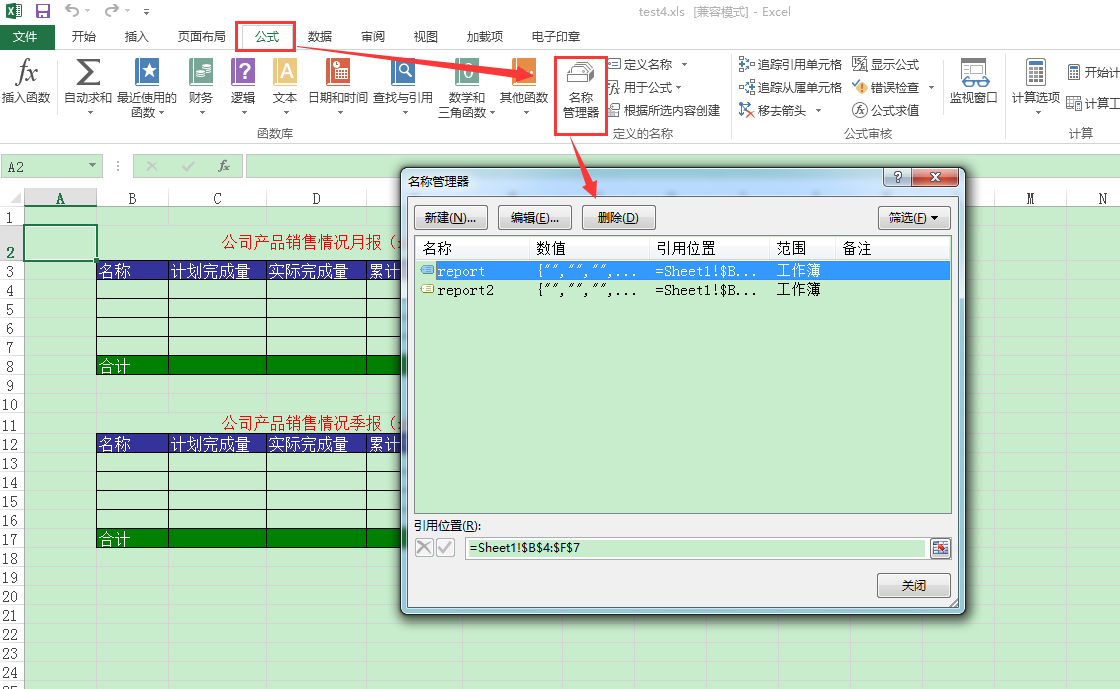 - 若是需要删除、修改定义好的单元格区域,可点击Office工具栏上的“公式→名称管理器“来对名称进行管理,如下图所示。