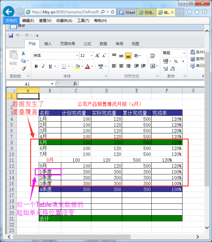 - 可以避免同一个Excel工作薄中有多个表格时,上面的表格数据行增长后与下面的表格数据出现互相覆盖的问题。 假如在一个Excel模板的同一个工作薄中,使用openTable(rangeAddress)方法打开两个不同的Table,分别为Table1(数据填充范围:第4-7行,行数:4行)、Table2(数据填充范围:第13-16行)。而要动态填充到Table1里的实际数据行数为12行,超过了指定的单元格区域行数,且Table1设置了默认自动扩展单元格行数到实际大小,并且给新的单元格数据行应用 RangeAddress 指定的单元格区域的格式,那么数据填充完后,Table1的实际填充范围应该是第4-15行;然而由于Table2的起始填充位置是不变的,还是从第13行开始填充,这样一来,Table2填充的数据就会覆盖Table1第13-15行的数据,即发生数据重叠覆盖的现象。