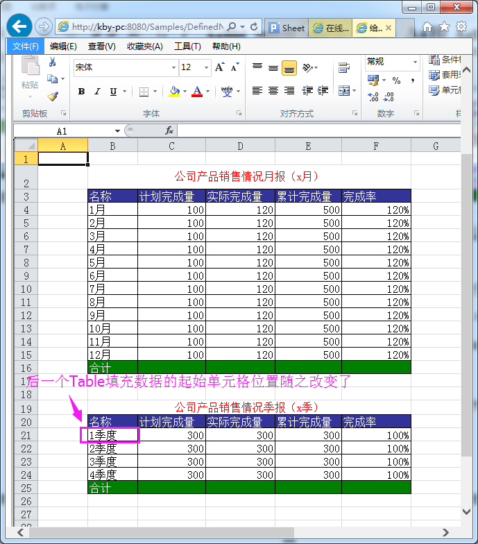 而如果使用openTableByDefinedName()来分别打开这两个Table,且设置表格也会按实际数据行数自动扩展,当Table1自动扩展后数据行数为12行,填充范围为第4-15行时,Table2的起始位置将不再是固定不变的,Table2的起始位置由原来的第13行变成了第21行,填充范围为第21-24行。这样一来,前后两个Table的数据就不会发生重叠覆盖的现象了,填充数据后的效果如图3所示。